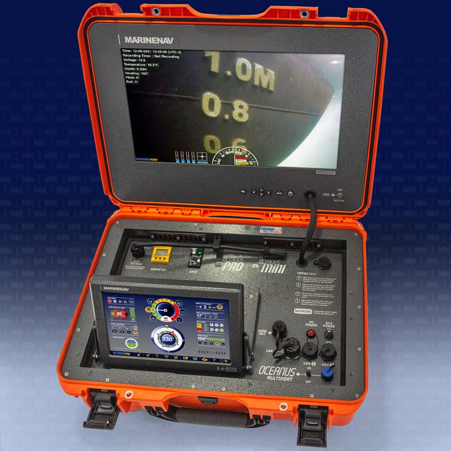 MarineNav’s Oceanus topside control case is a portable, self-contained IP-rated core component providing easy connectivity to the remaining ROV system components. A large viewing screen, a touch-sensitive ROV command screen, a variety of ports and a massive internal data drive are just some of the features that distinguish our ROV control system from our competitors.